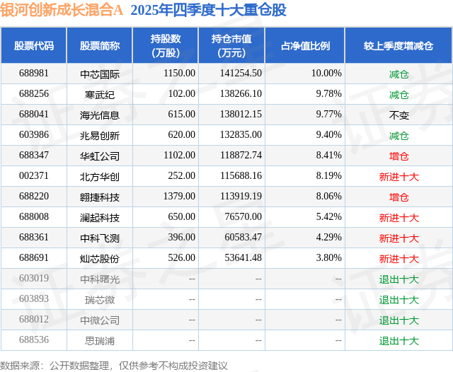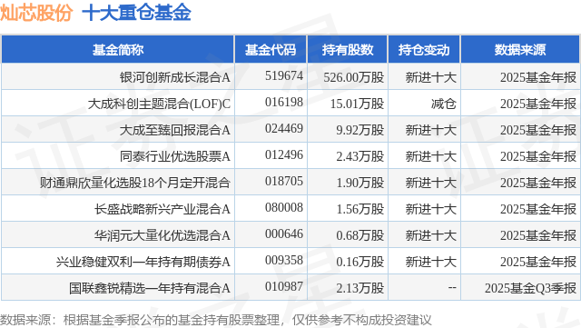 根据2025基金年报公募基金重仓股数据,重仓该股的公募基金共8家,其中持有数量最多的公募基金为银河基金的银河创新成长混合A。银河创新成长混合A目前规模为114.58亿元,最新净值10.4603(1月28日),较上一交易日上涨1.45%,近一年上涨66.49%。该公募基金现任基金经理为郑巍山。郑巍山在任的基金产品包括:银河和美生活混合A,管理时间为2020年2月17日至今,期间收益率为39.03%;银河产业动力混合A,管理时间为2022年3月17日至今,期间收益率为44.94%;银河智联混合A,管理时间为2022年3月17日至今,期间收益率为74.98%。